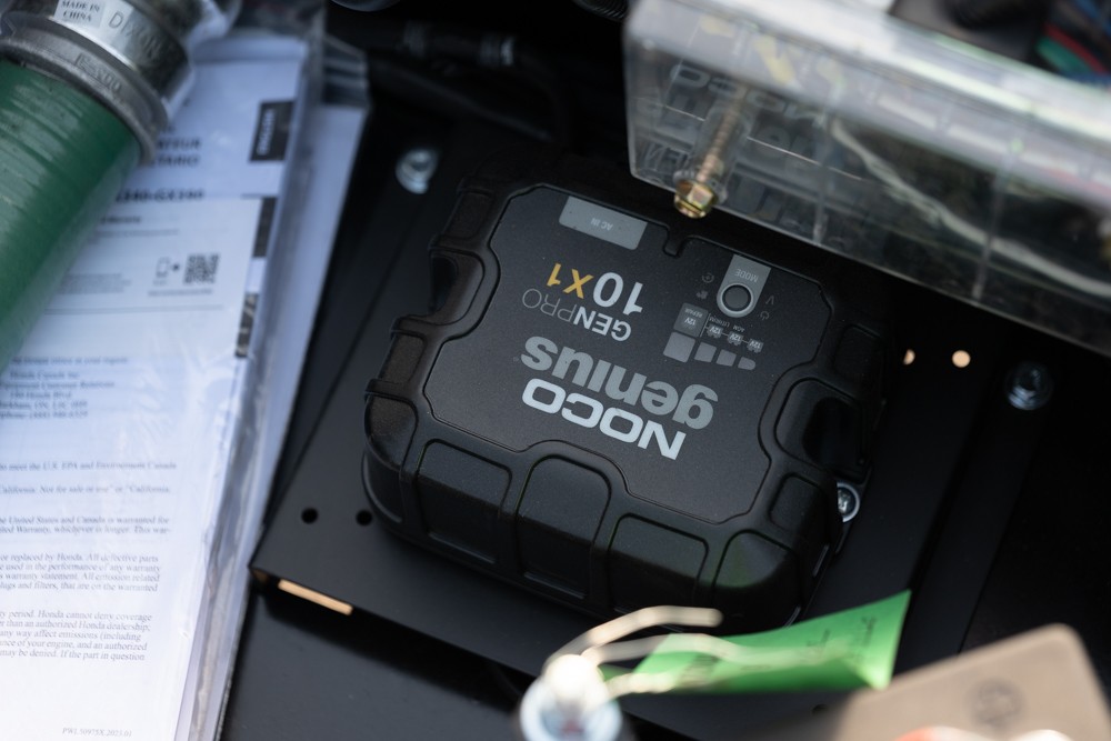Travaillez n'importe où avec un boîtier de batterie verrouillable et un chargeur qui peuvent recevoir l'alimentation de votre connecteur de feu de remorque ou charger à partir d'une prise standard de 110 V.